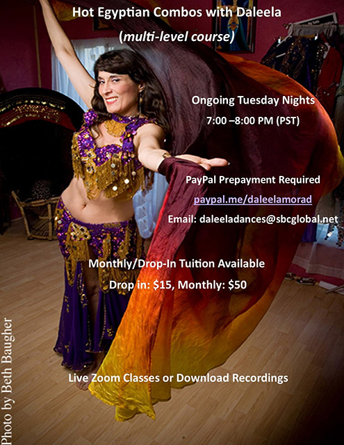 You will dance away with correct posture, technique, musicality, drills, combinations and choreography. Also, you will learn about the cultural significance/history of the dance, Egyptian dance drum rhythms and about the instruments.